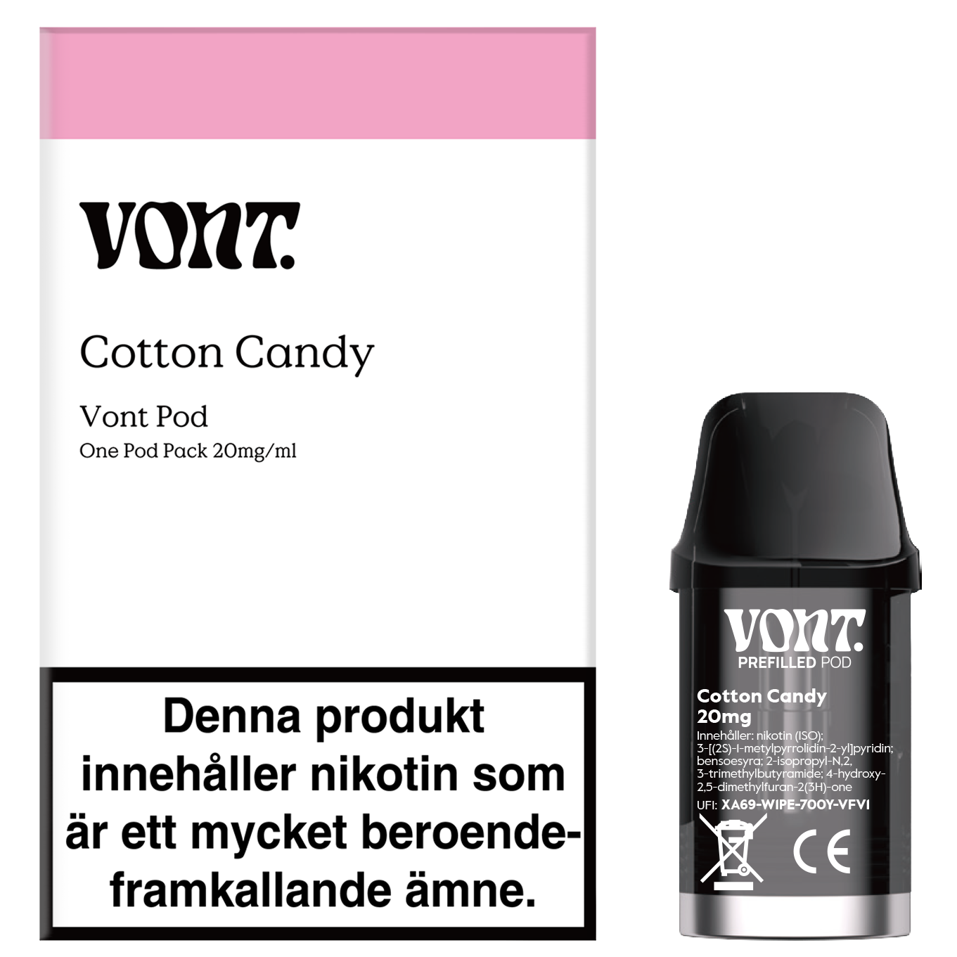 VONT POD COTTON CANDY 20MG är en förfylld refillpod från VONT med en söt och nostalgisk smak av klassisk sockervadd. Smakprofilen är mjuk, len och tydligt söt med en lätt vaniljliknande ton som ger en rund och behaglig ångupplevelse. Podden är avsedd att användas tillsammans med en separat VONT-kompatibel pod-enhet och kan inte användas fristående. Med en nikotinhalt på 20 mg nikotinsalt levererar VONT Pod Cotton Candy en jämn och effektiv nikotinkick i ett smidigt och lättanvänt podformat.